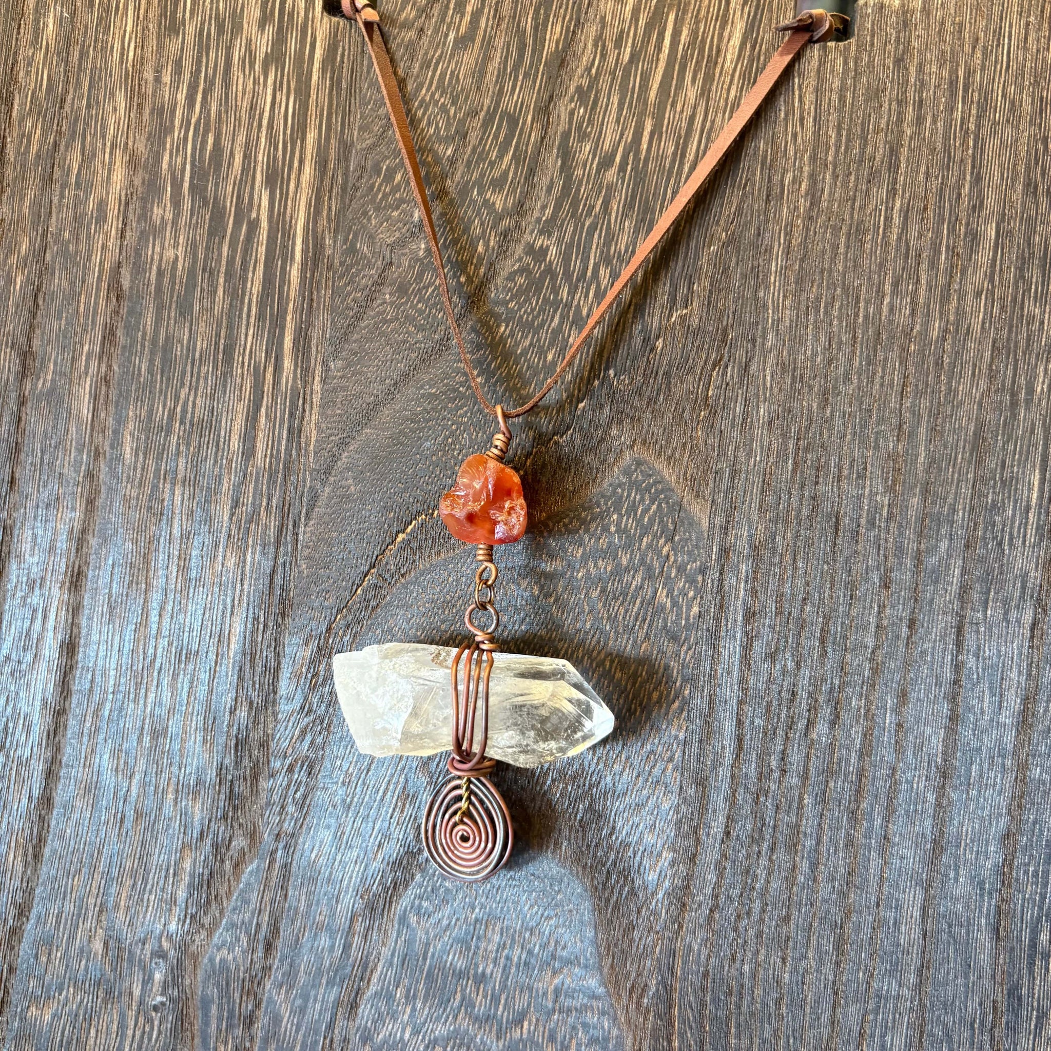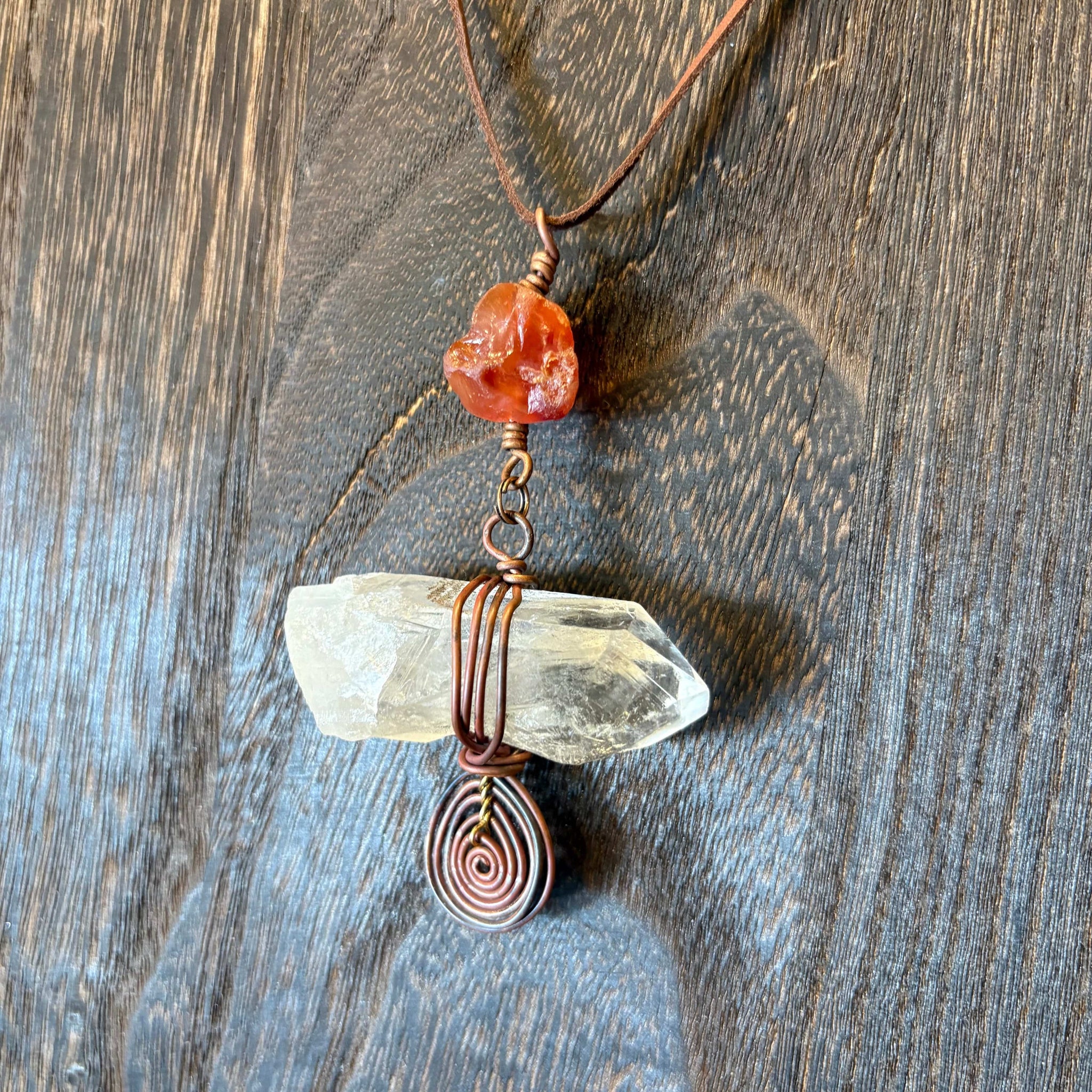 Featuring a beautiful naturally terminated Clear Quartz point with copper wrapping. Featuring a Carneilan bead at the top.