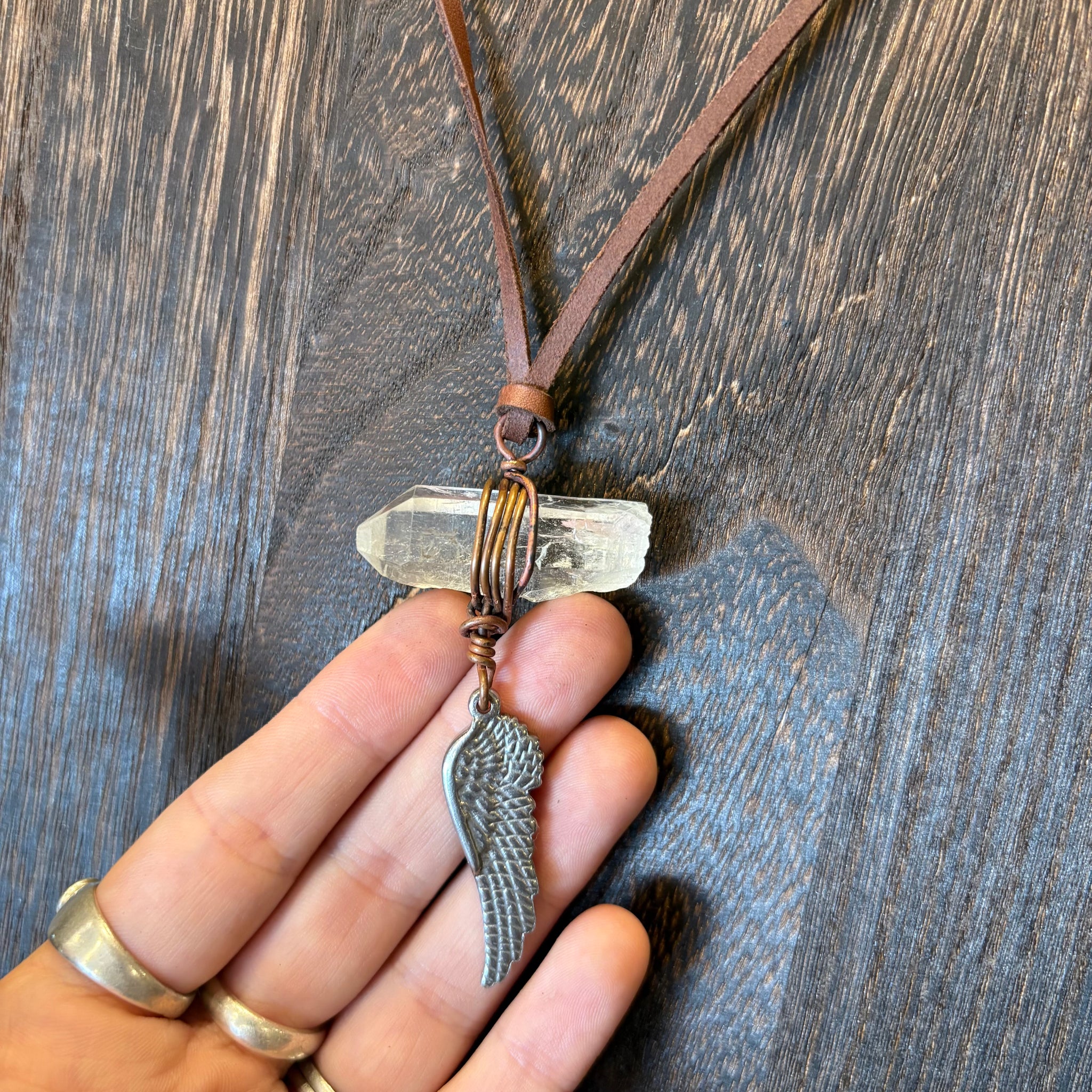 Featuring a beautiful Clear Quartz point with copper wrapping. Featuring an Angel wing charm at the bottom.