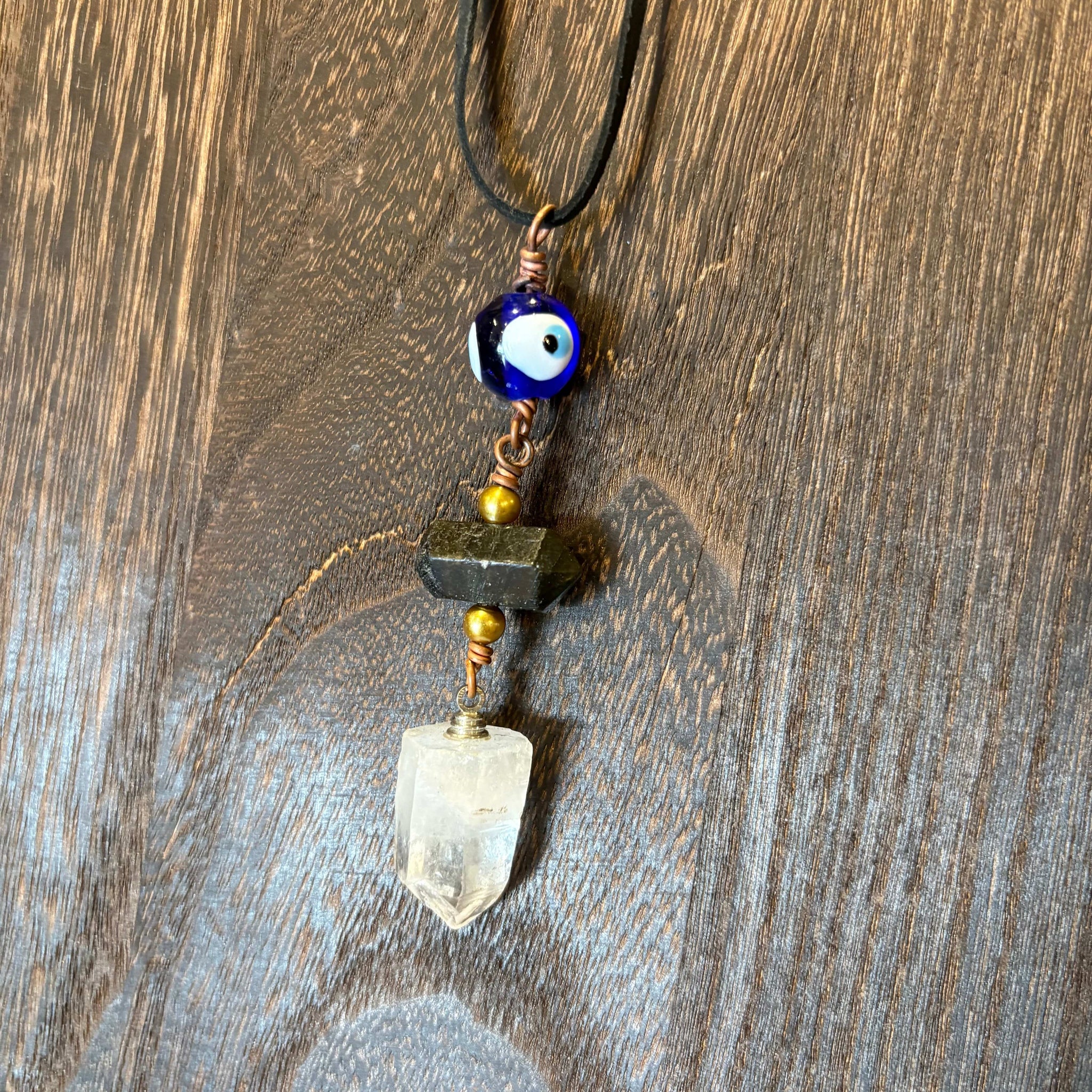 Featuring a beautiful Clear Quartz point with copper wrapping. Featuring a Labradorite and evil eye bead at the top.