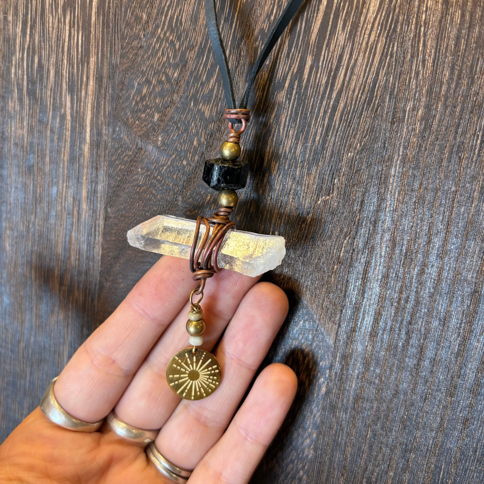 Featuring a beautiful Clear Quartz Point with copper wrapping. Featuring a Black Tourmaline bead at the top.